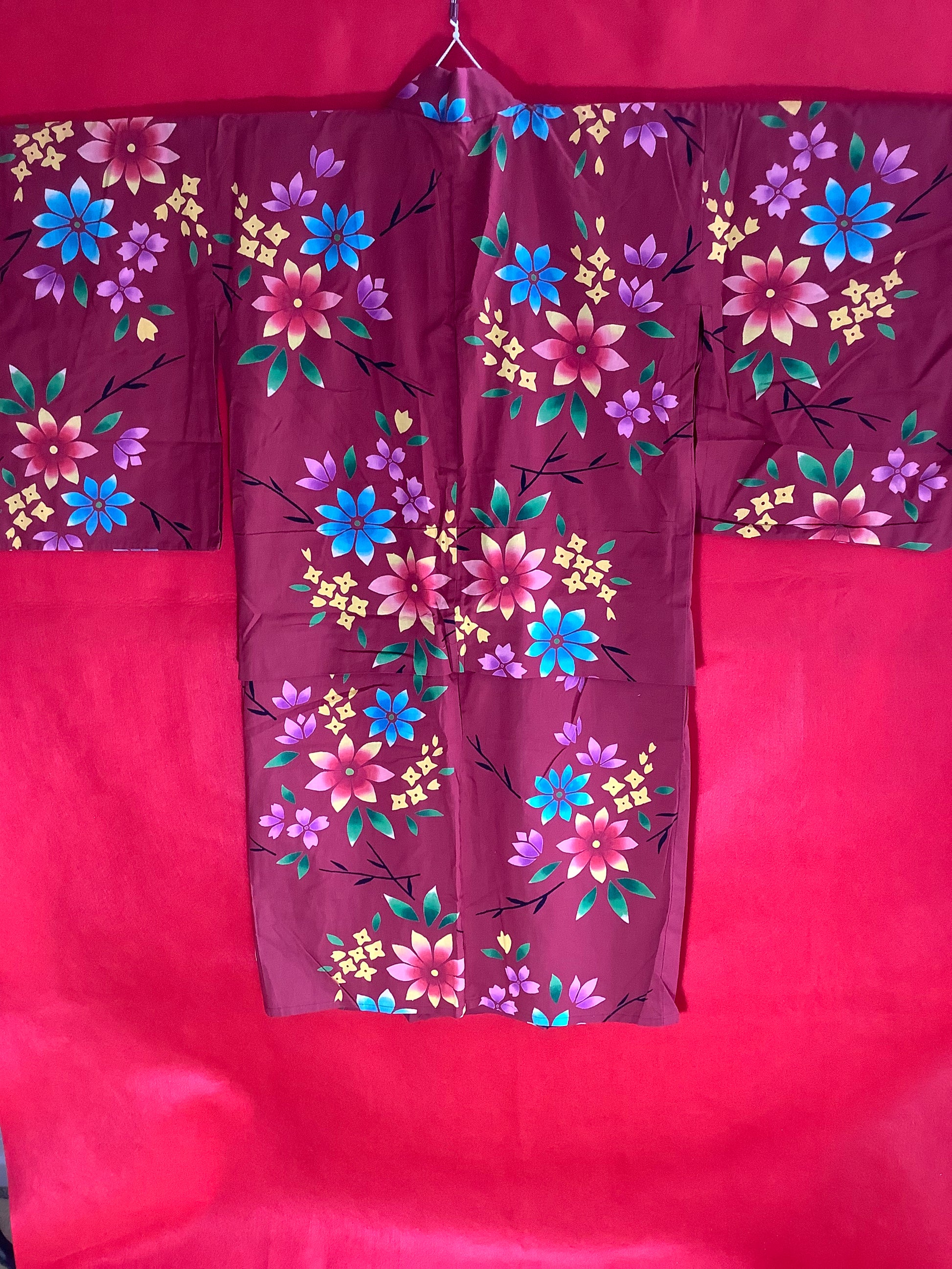A girls cotton yukata, with colourful flowers onto a deep red ochre background. There is a deep tuck at the waist. Condition is excellent.